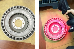 渦輪葉片的角度會(huì)影響到裝配后整體的性能,因此客戶需要獲得精準(zhǔn)的三維數(shù)據(jù)從而用于葉片角度的檢測。根據(jù)客戶的需求,工程師使用HSCAN300手持式激光三維掃描儀方便快捷地獲取三維數(shù)據(jù)。整個(gè)過程無需噴反差增強(qiáng)劑也進(jìn)一步保持了工件的原始狀態(tài),保證了精度。